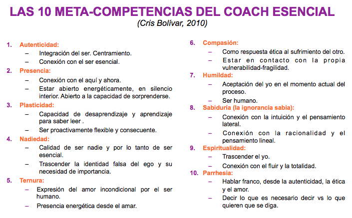 Por eso, más allá de las competencias es necesario, para mi, hablar de meta-competencias en el caso del Coach Esencial tenemos 10: