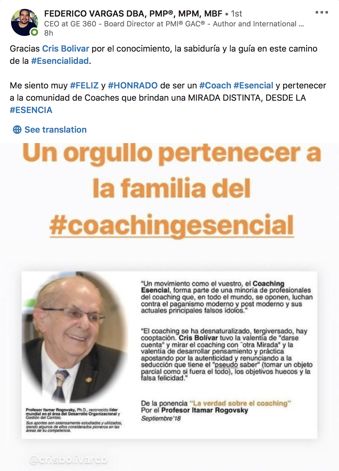 ?». /. «Divertida y entrañable celebración de los 15 años del Coaching Esencial, en el I Encuentro Internacional de Coaches Esenciales. Un placer, un honor y muchas emociones de alegría, ilusión, compañerismo y esperanza. Compartir con personas de todas partes, amigas, y latir juntos por una voz. Por un coaching de calidad, respetuoso con la ternura y fragilidad de la condición humana desde luego enaltece, encumbra y reivindica el trabajo en red para el desarrollo humanístico y el verdadero Desarrollo Económico. Juntos es mejor y con calidad mucho más. Un abrazo compañeros y un latido de fe y esperanza por esta hermosa profesión, pasión y retos.» Lorelis Cova - «El I Encuentro Internacional de Coaching Esencial fue un día lleno de emociones, encuentros, sorpresas, alegría y celebración. El trabajo de estos años junto a Cris Bolívar y al equipo esencial se plasmó en una gran fiesta de cumpleaños donde disfrutamos todo el proceso de creación como niñxs.» Jade Salvador