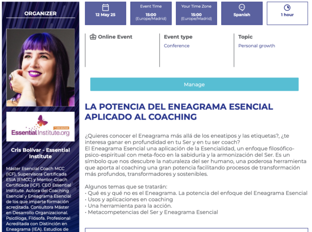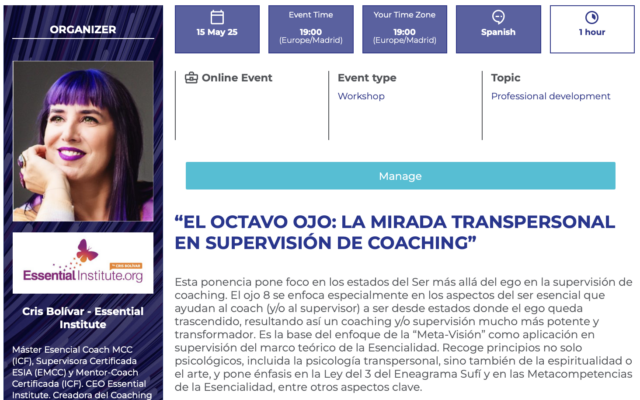 Exploraremos y abriremos debate sobre algunas distinciones importantes, y veremos una demo de sesión de Coaching Esencial nivel MCC donde se aplicarán alguno de los conceptos y se verán herramientas del ámbito de la Psicología Transpersonal y Sufí que podrían utilizarse.