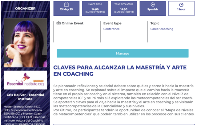 Se plantearán reflexiones y se abrirá debate sobre qué es y como ir hacia la maestría y arte en coaching. Se explorará sobre el impacto que el camino hacia la maestría tiene en el propio ser coach y en el sistema, también en relación con el Nivel 3 de competencias ICF y se irá más allá explorando las metacompetencias del ser coach. Se aportarán claves para el viaje hacia la maestría y el arte en coaching y se visitarán las metacompetencias de la Esencialidad y sus niveles.