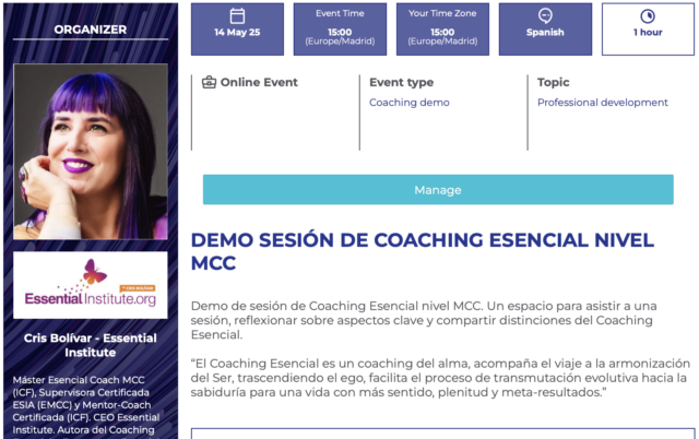 Demo de sesión de Coaching Esencial nivel MCC. Un espacio para asistir a una sesión, reflexionar sobre aspectos clave y compartir distinciones del Coaching Esencial.