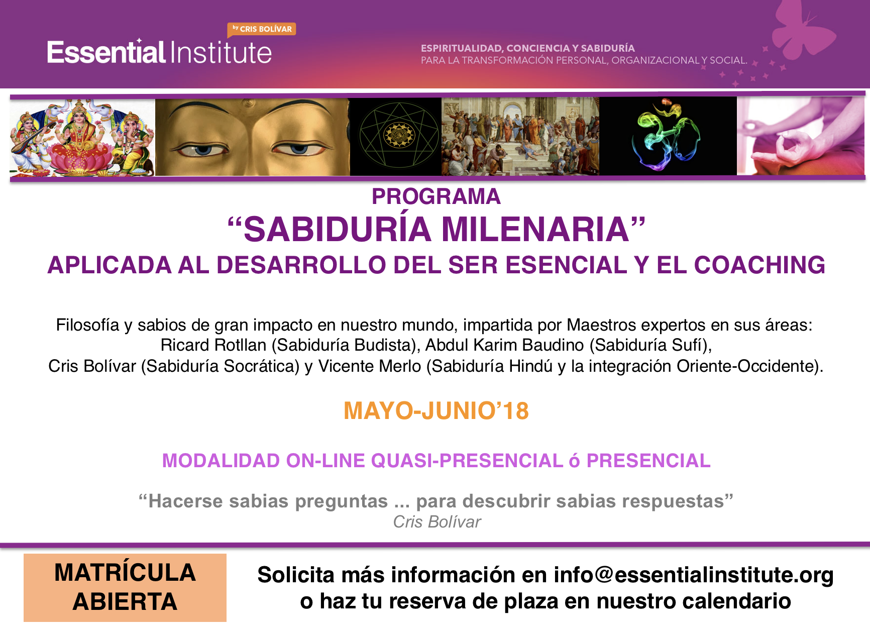 El programa de Sabiduría Milenaria, recoge filosofías y sabios de gran impacto en nuestro mundo impartido por Maestros y profesores expertos en sus áreas: